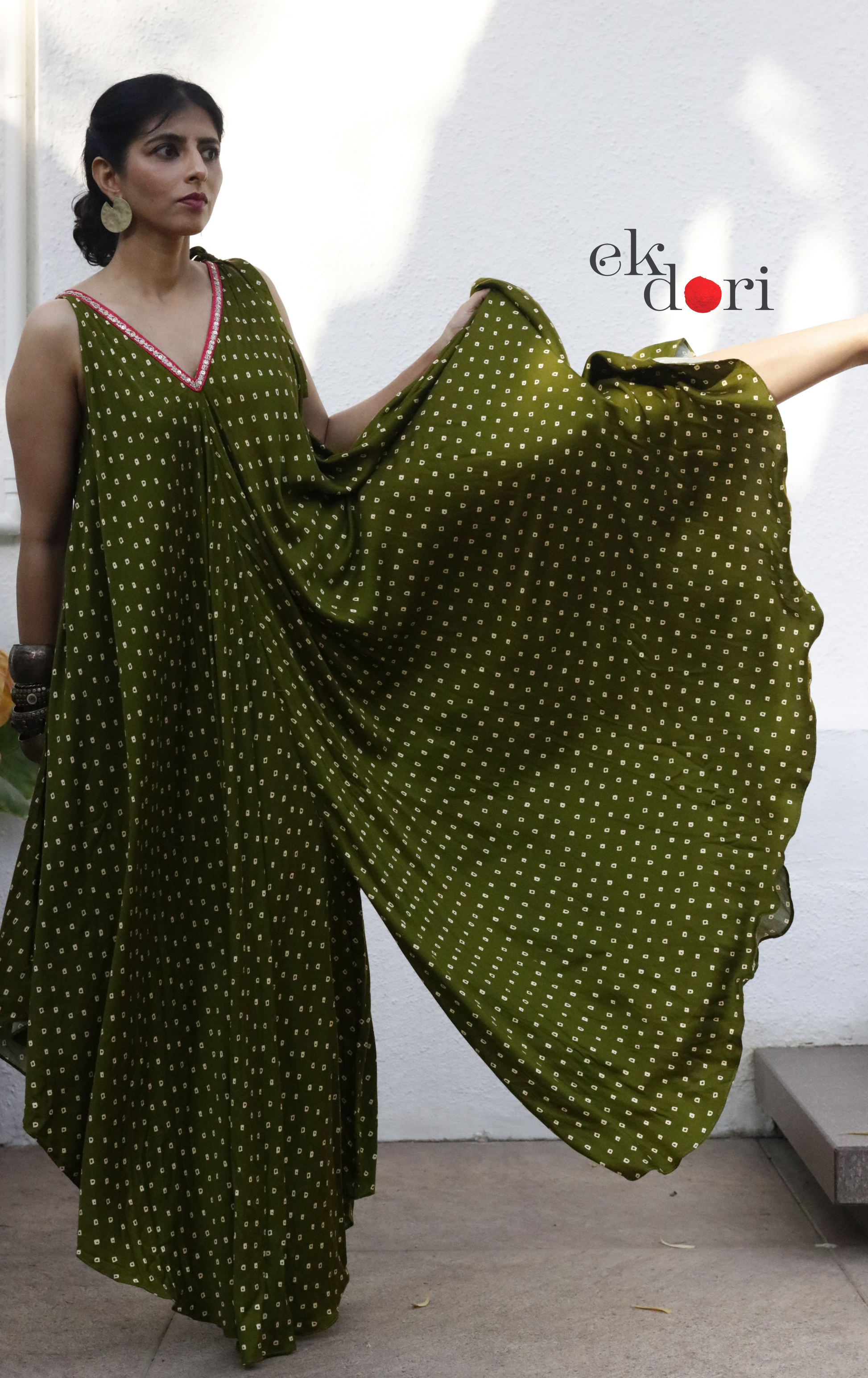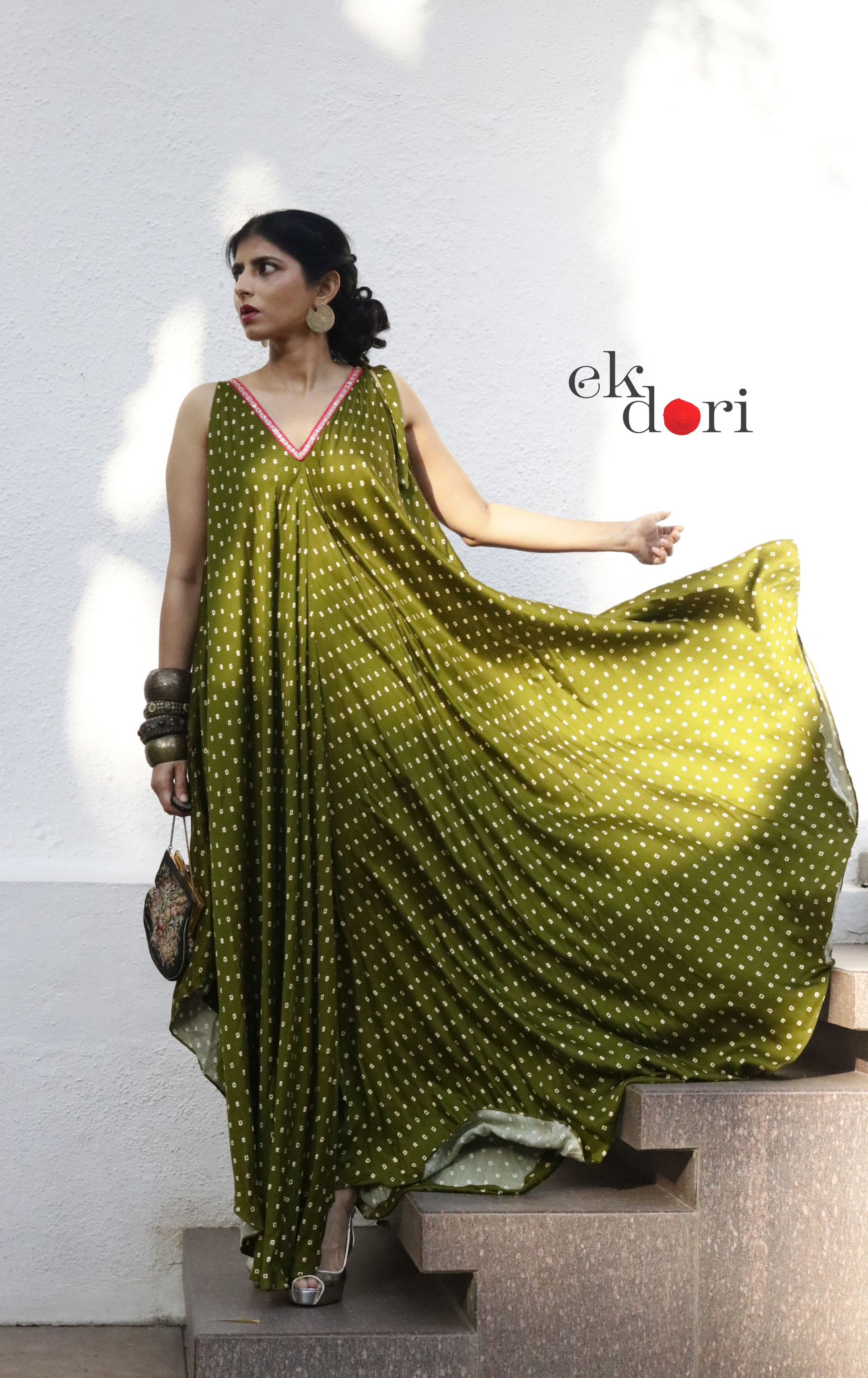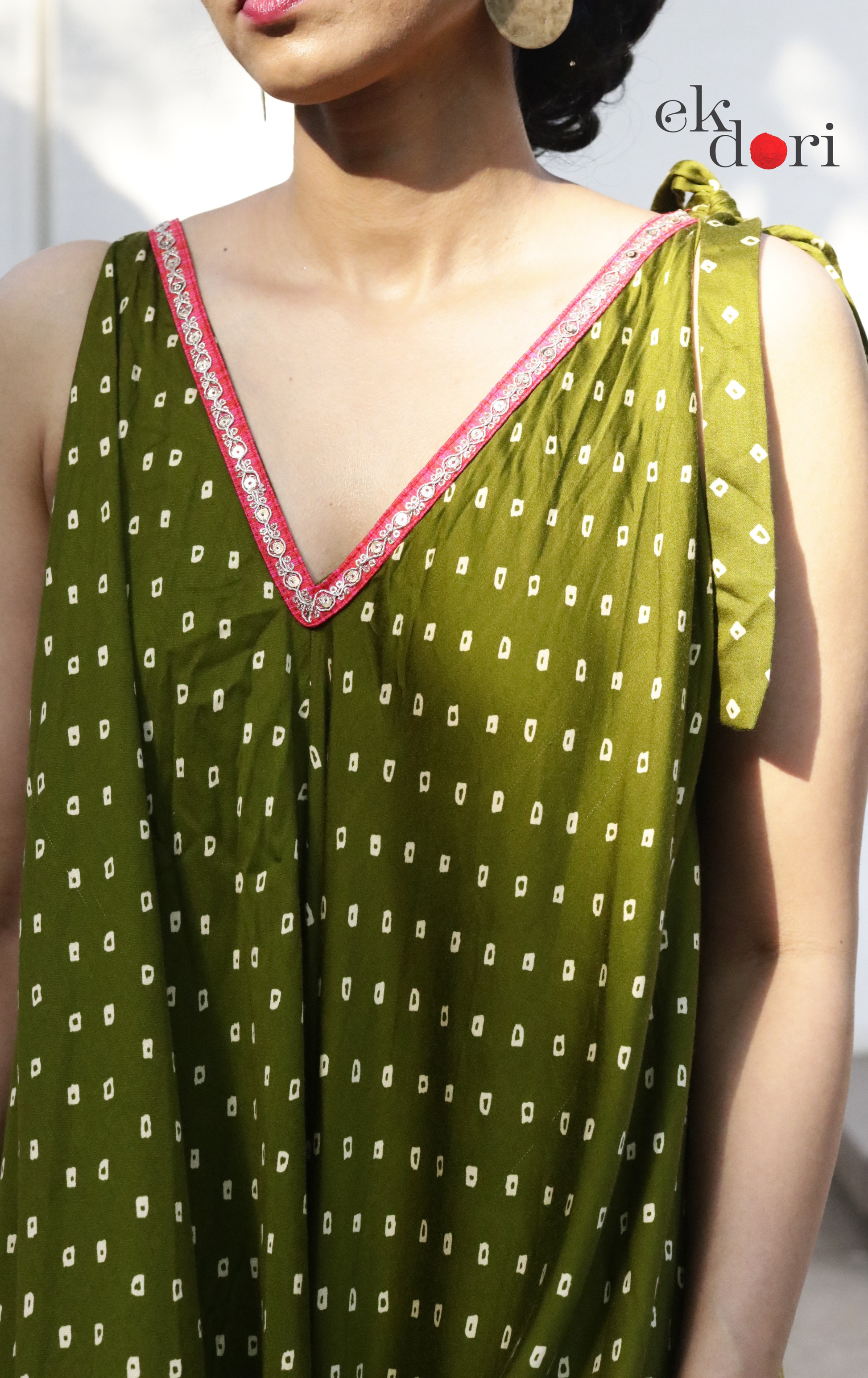 An ode to traditions, comfort and old world charm. The Bandhani Print (not hand knotted Bandhani) 'Henna' Satin Cotton Jumpsuit in a beautiful henna green colour is fun, functional and modern in a playful silhouette.
