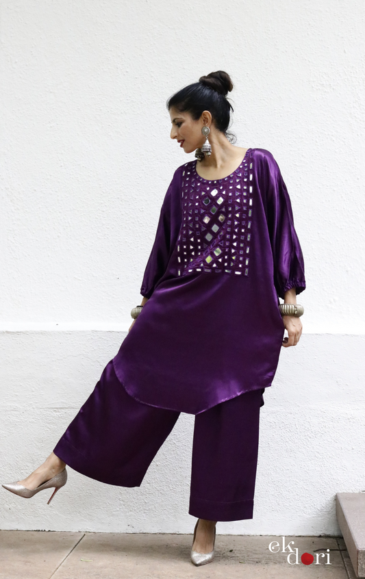 'Deep Purple' Mashru Mirror Work Co-ord Set in Purple : Buy Palazzo Kurta Festive Co-ord Set