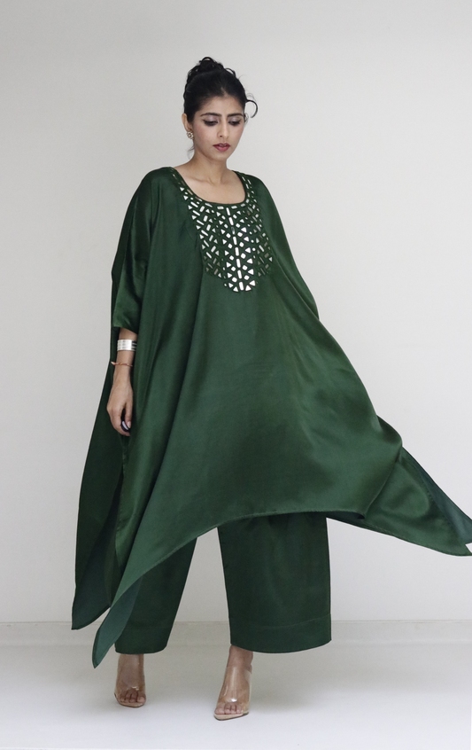 Mashru Mirror Work Co-ord Set in Green 'Bela Baahar' : Buy Palazzo Kaftan Kurta Festive Co-ord Set