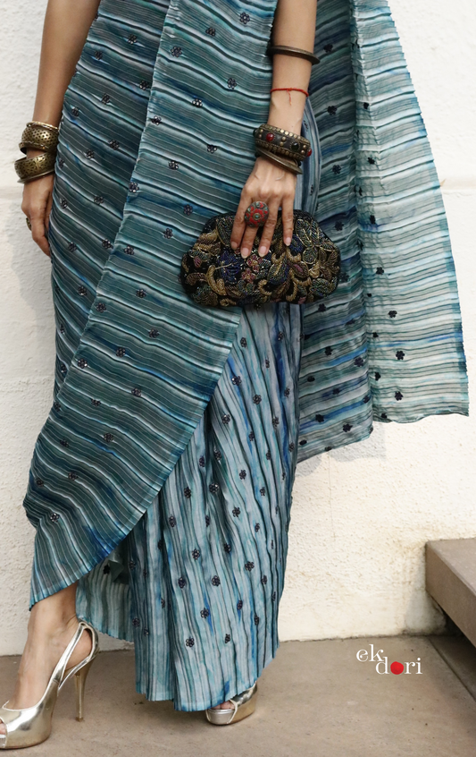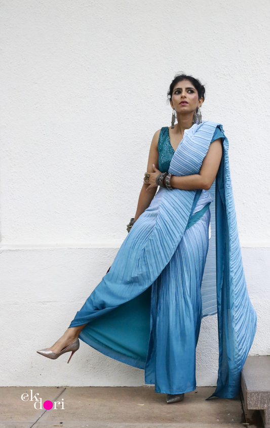 'Deep Ocean' Ready To Wear Draped Saree Skirt : Fun Modern Micropleated Quick Draped Saree