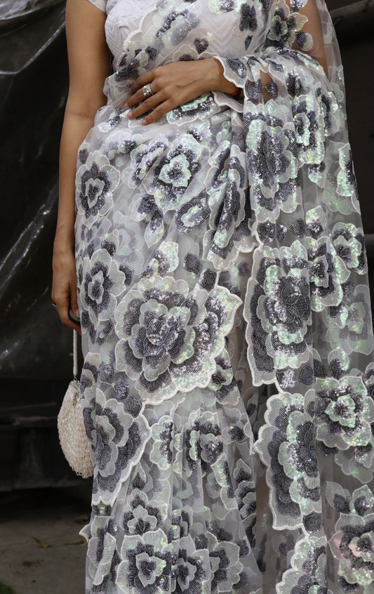 White Floral Sequin Saree : 'Winter Garden' Sequin Cocktail Saree : Sequin Bollywood Saree