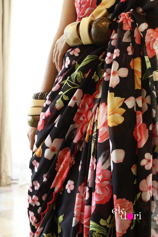 Buy Bold Floral Saree 'Sweet Escape' Scalloped Muslin Saree : Black And Floral Saree