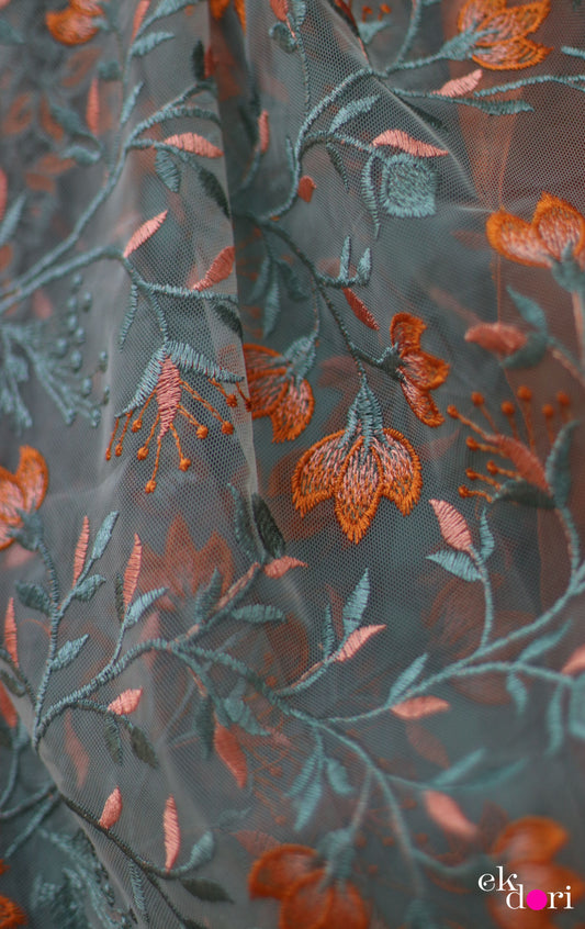 Buy Designer Net Saree : Powder Blue Floral Red Net Saree
