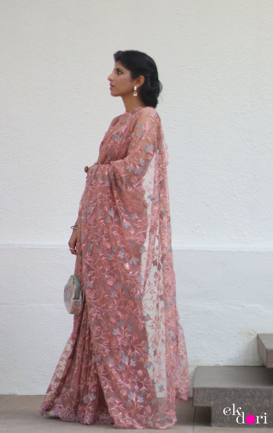 Buy Designer Net Saree : Baby Pink Floral Red Net Saree