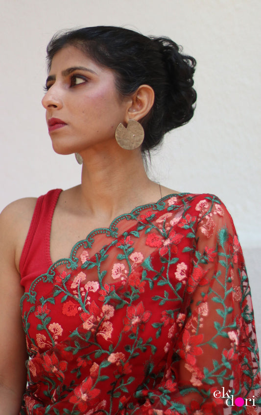 Buy Designer Net Saree : Rose Garden Floral Red Net Saree