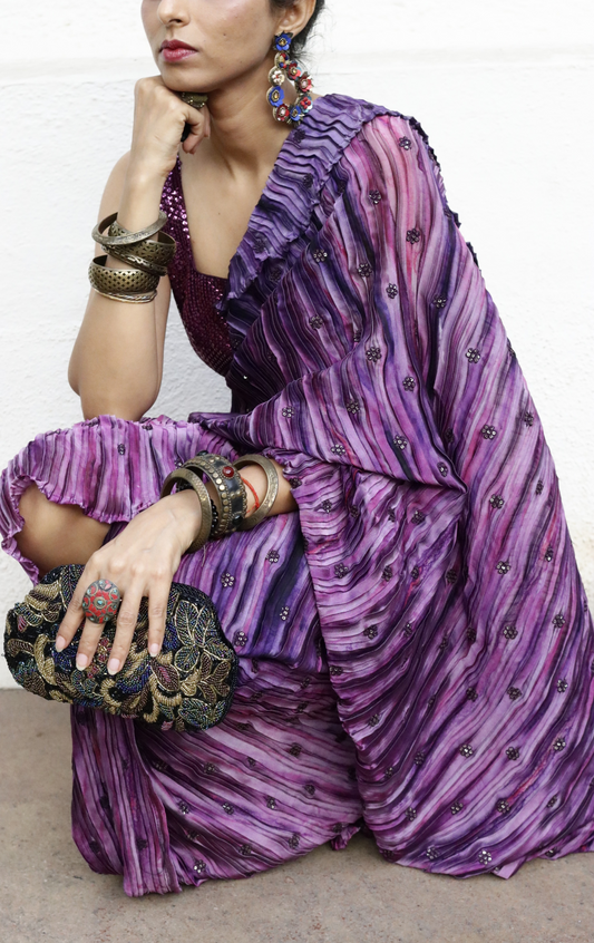 'Purple Plum' Ready To Wear Draped Saree Skirt : Fun Modern Micropleated Quick Draped Saree
