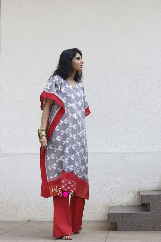 Monsoon Clouds Handloom Ikat Kaftan Kurta Dress : Grey Ikat Kaftan Kurta