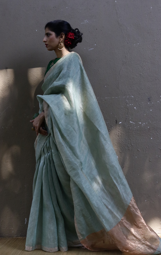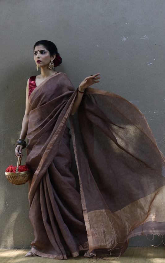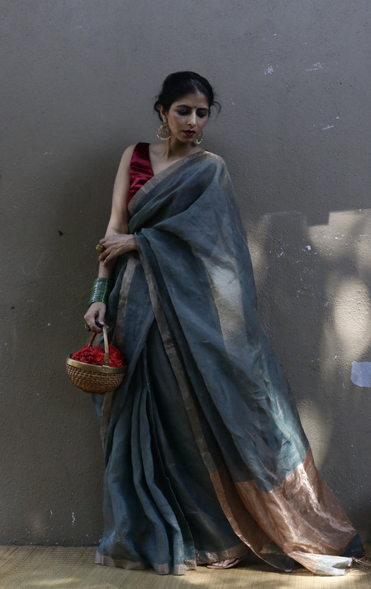 The sarees combine the comfort of light gauzy high quality linen and glistening gold zari threads to create a saree that is comfortable and yet festive and formal. The evergreen linen zari saree is versatile and can be worn with a contrast silk blouse for a wedding or with a simple cotton linen blouse for a casual outing.