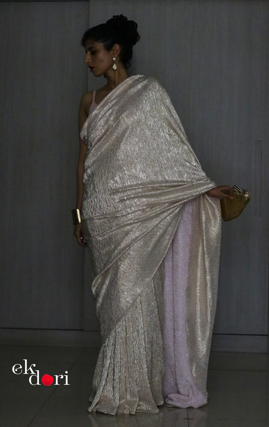 Golden Pink Evening Cocktail Saree 'Gold Garden' : Micro Pleated Designer Gold Saree : Metallic Gold Cocktail Saree