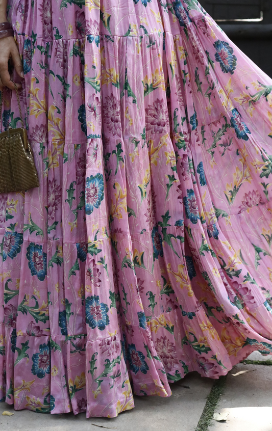 'Pink Paisley' Printed Fun Light Lehenga Saree : Fun Tiered Ready To Wear Lehenga Saree