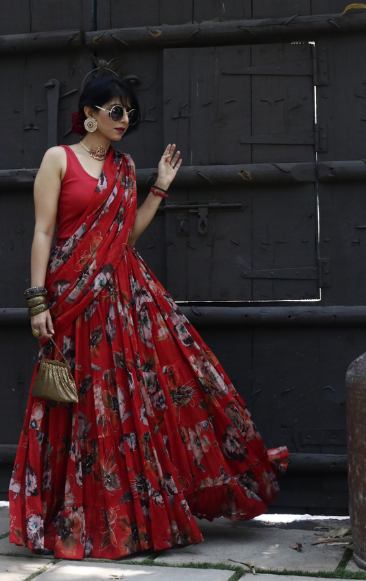 'Laal Gulaal' Printed Fun Light Lehenga Saree : Fun Tiered Ready To Wear Lehenga Saree