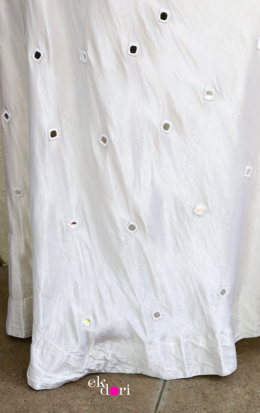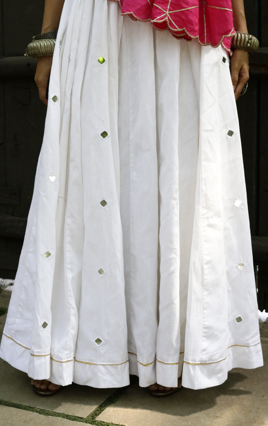 'Taj Mahal' Mirror Work Cotton Lehenga : Festive Ivory Colour Navratri Kutch Lehenga With Mirror Work