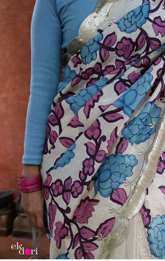 Neel Gulaab Pen Kalamkari Silk Saree : Festive Pure Silk Pen Kalamkari Saree