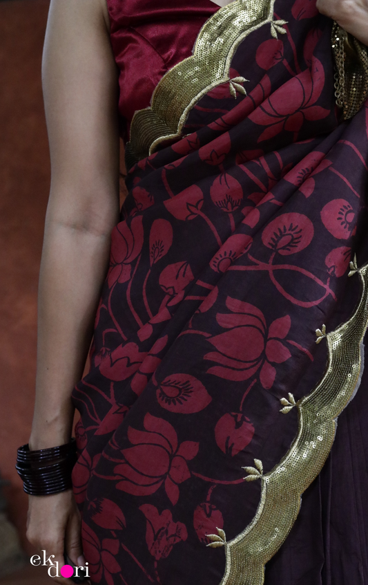 Red Lotus Pen Kalamkari Silk Saree : Festive Pure Silk Pen Kalamkari Saree