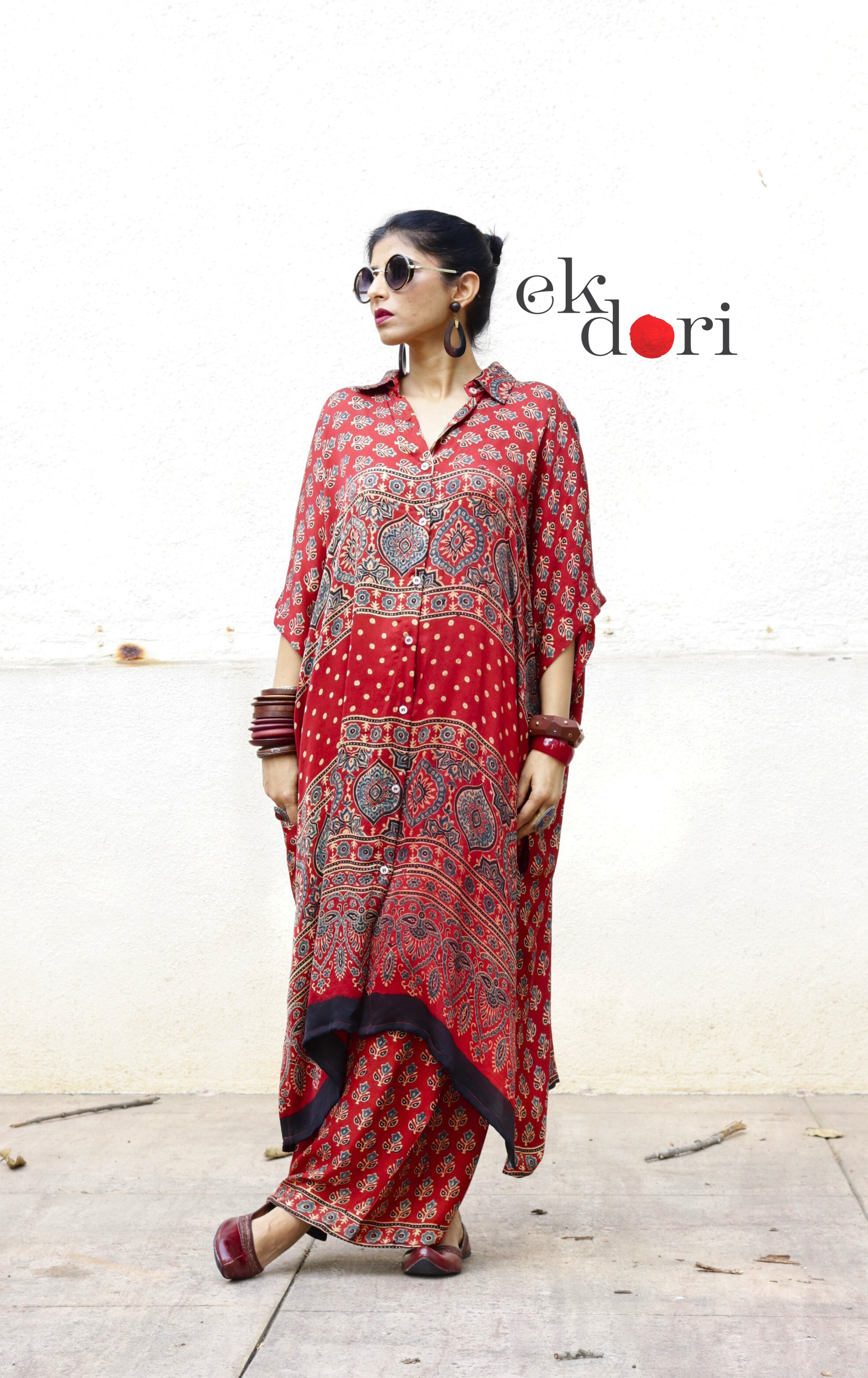Ajrakh Kaftan Kurta Dress 'Bageecha' : Modal Ajrakh Hand Block Kaftan Kurta & Palazzo Set