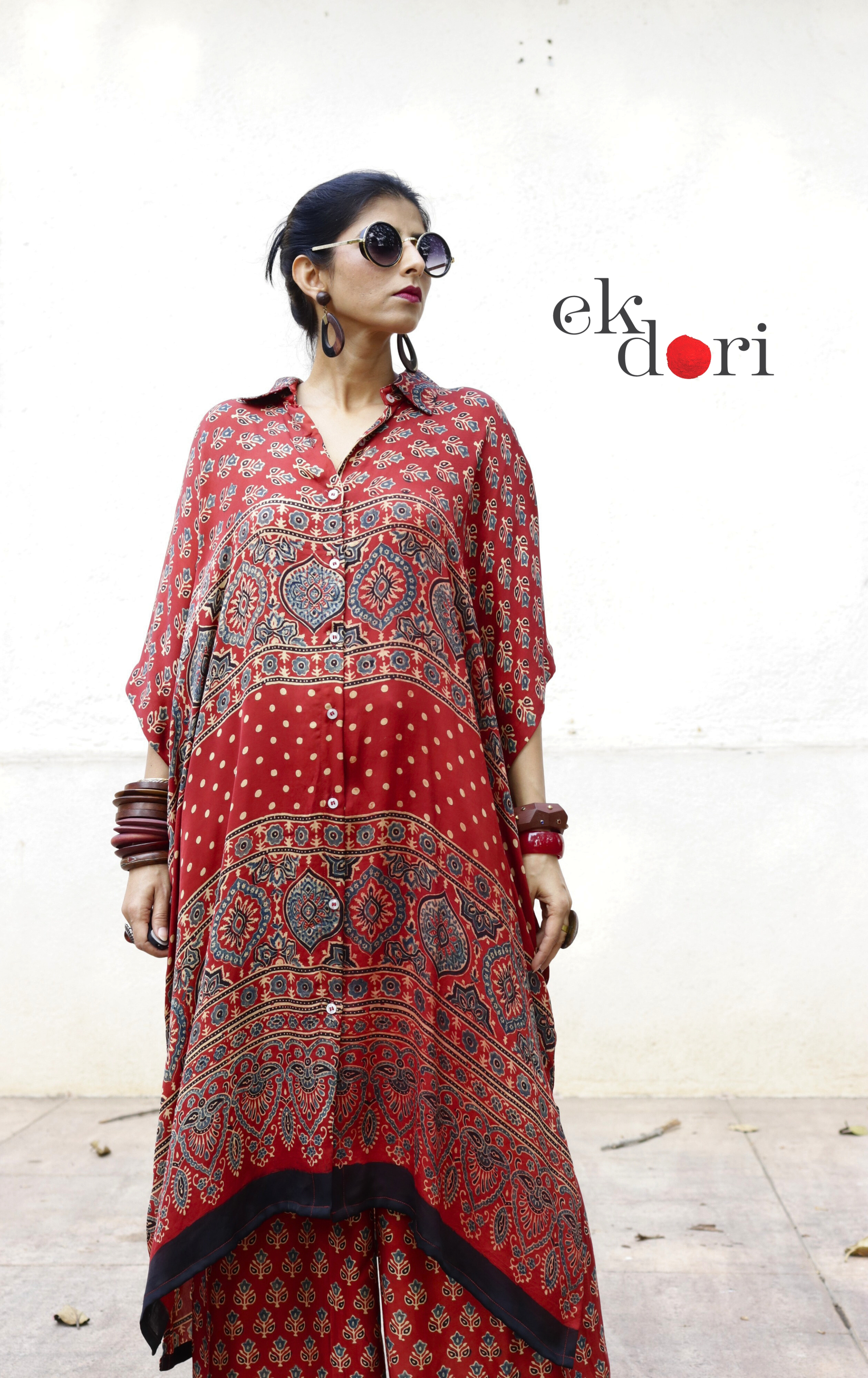 The kaftan kurta & palazzo co-ord set is a statement set - regal in its colours and the craft of Ajrakh. It is soft to touch and beautiful to move in. It is a unique one of a kind piece with a rich feel, texture and a beautiful sheen. The Ajrakh pattern on the body has been hand block printed using natural colours.