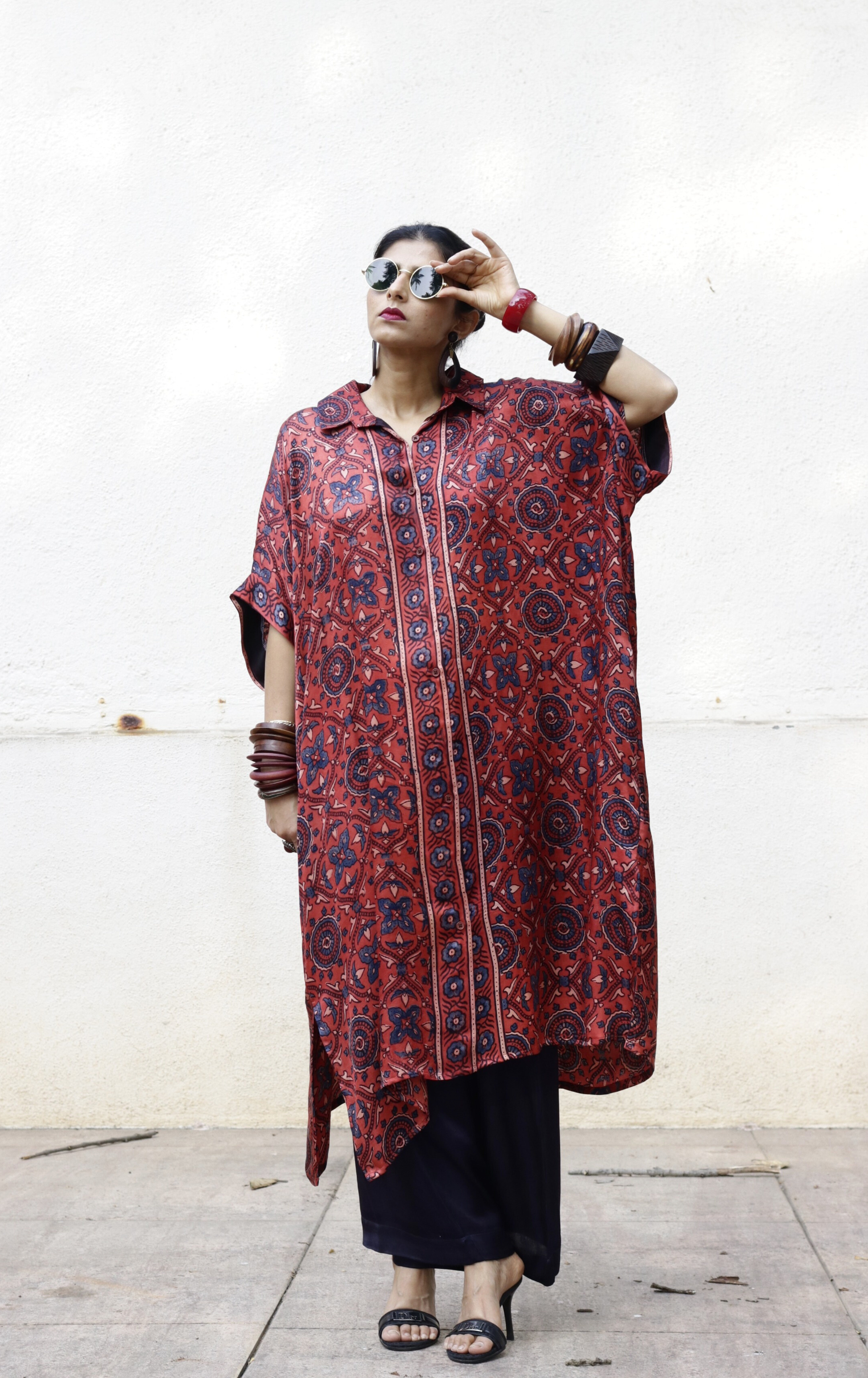 Ajrakh Kaftan Kurta Dress 'Gulzaar' : Modal Ajrakh Hand Block Kaftan Kurta & Palazzo Set