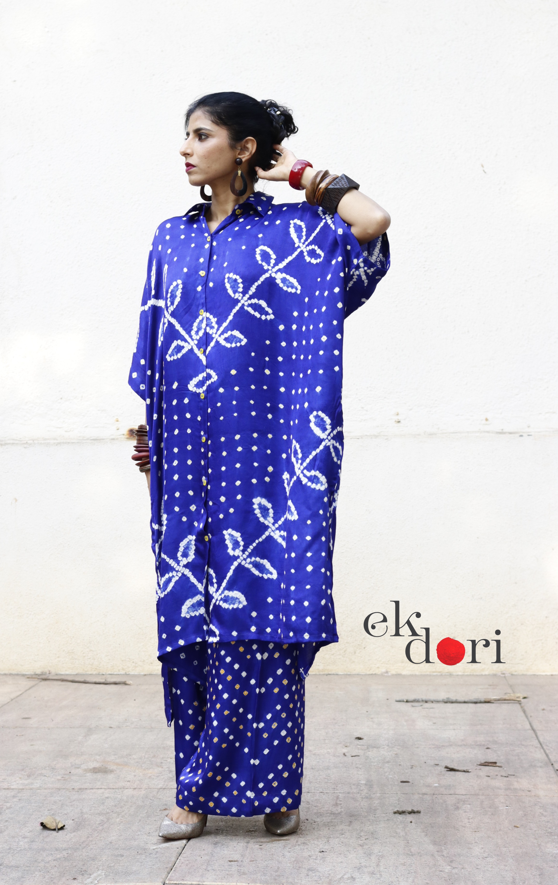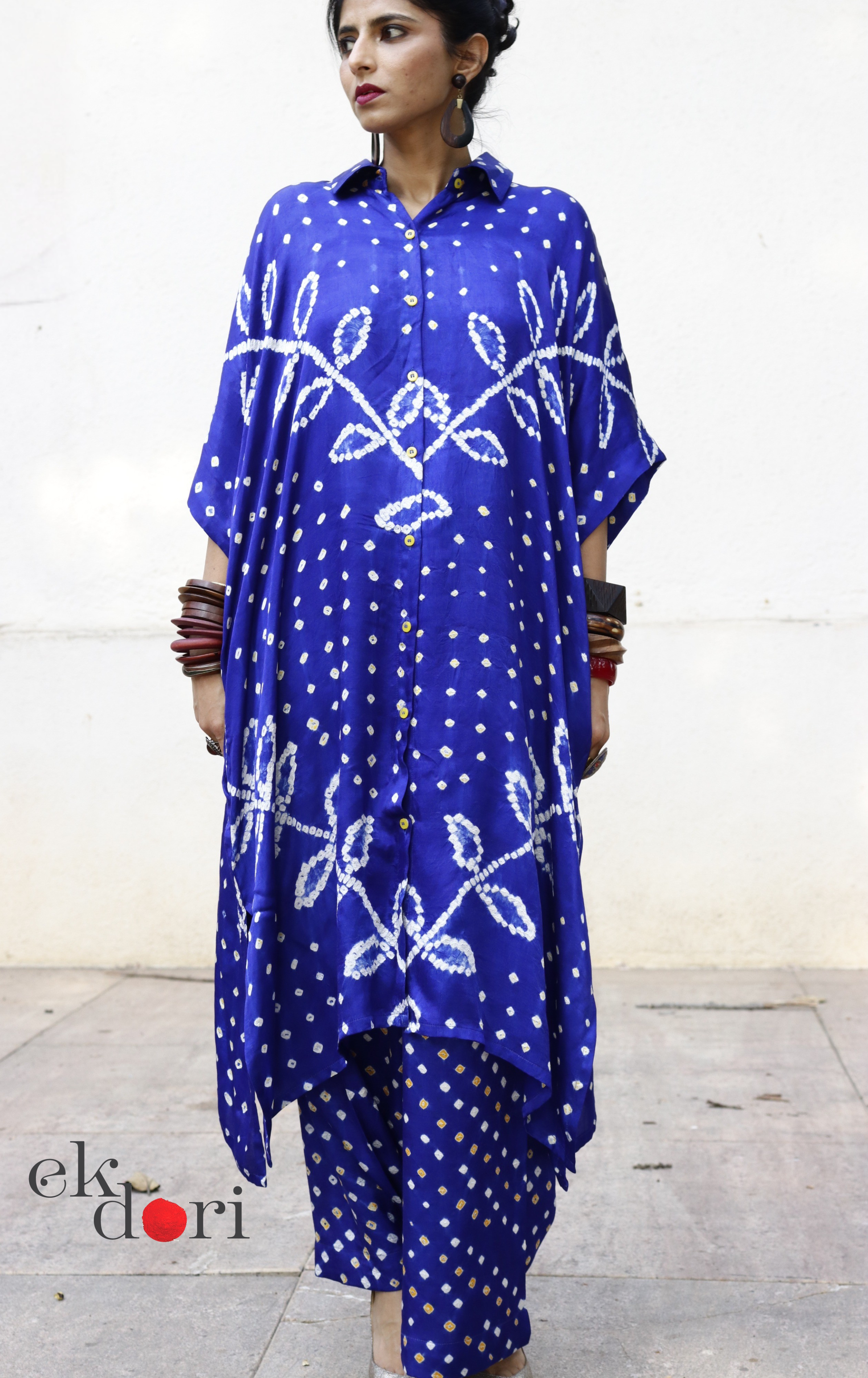 The set consists of a shirt style bandhani kaftan kurta, and the most comfortable palazzo.