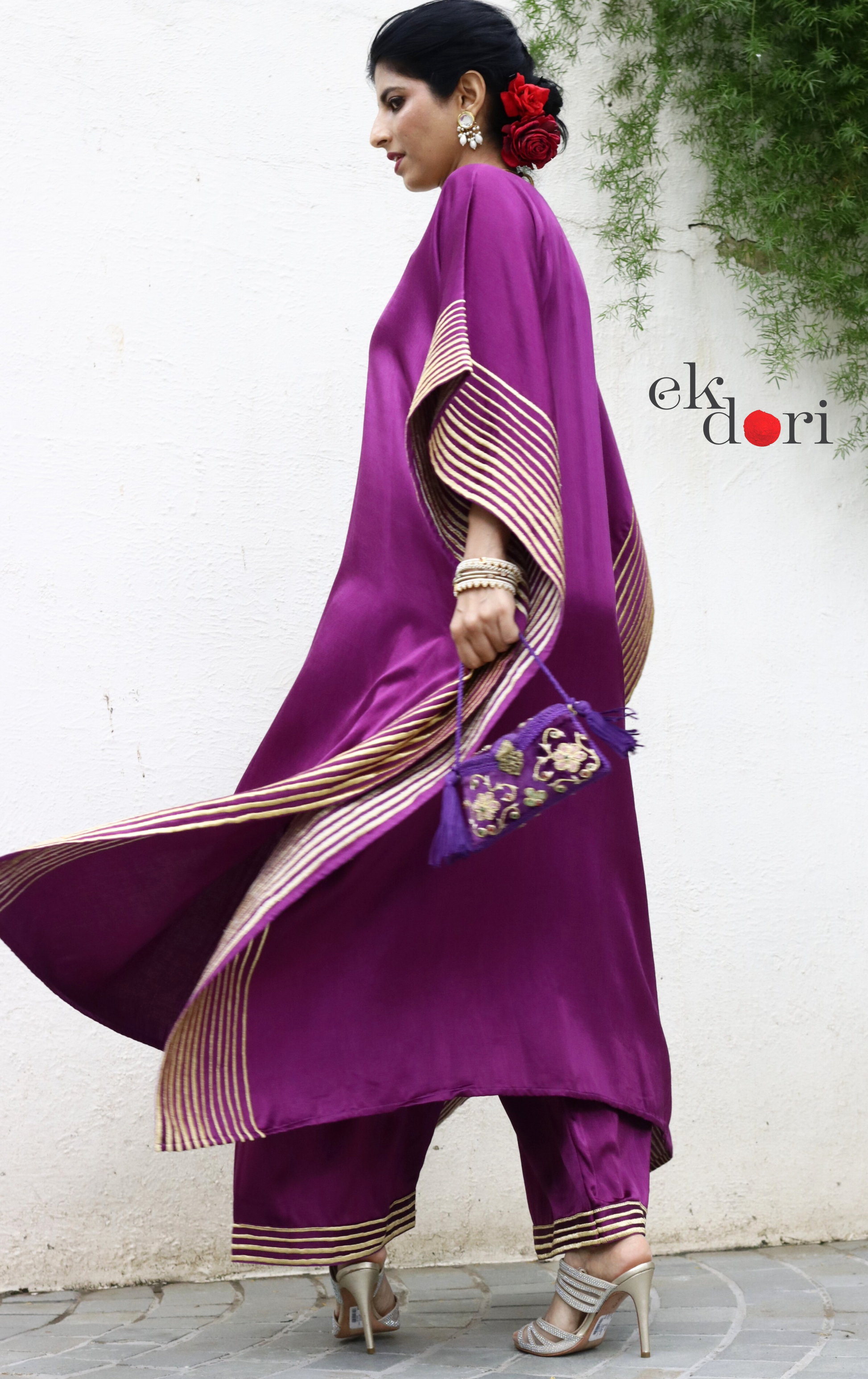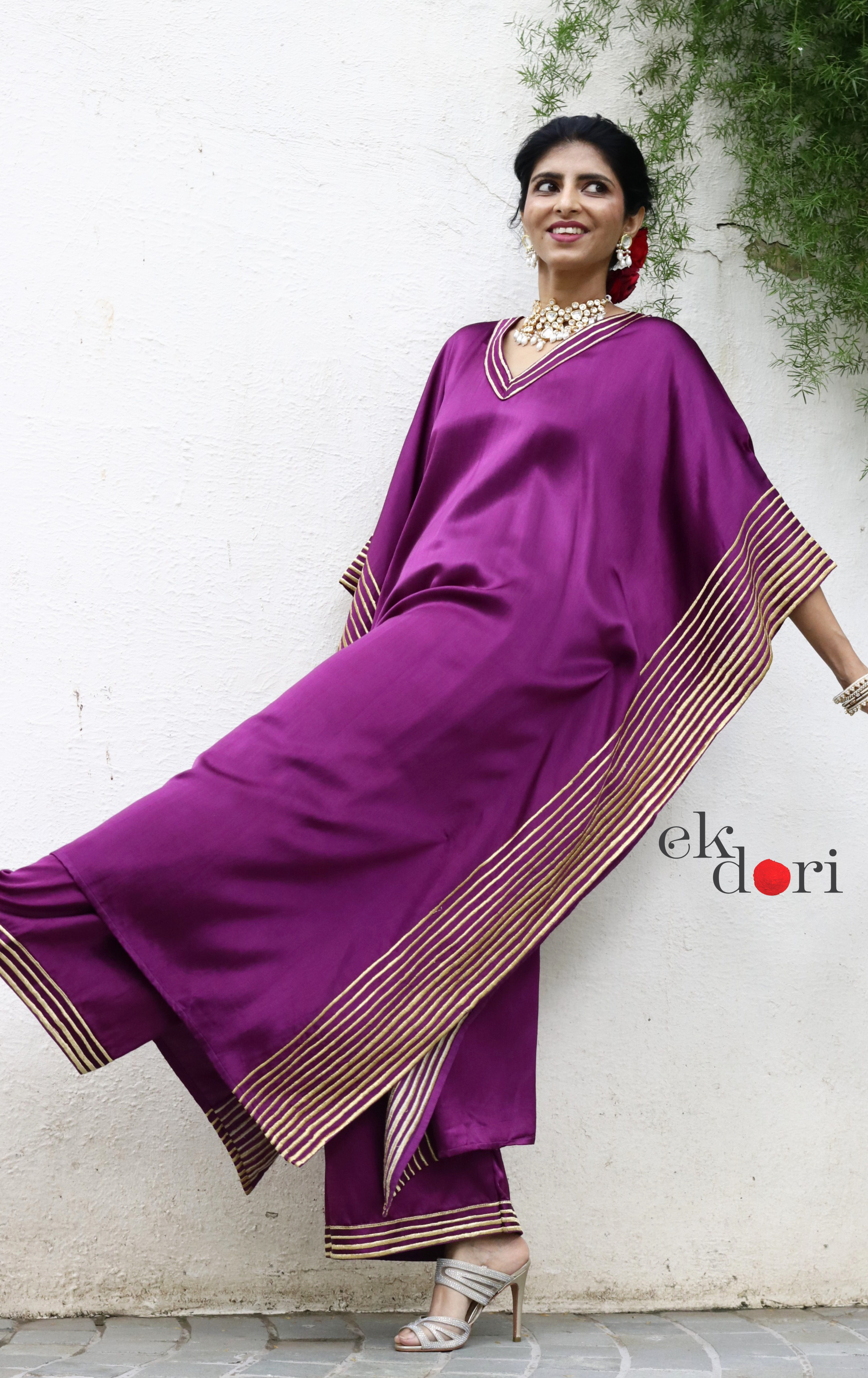 Mashru Kaftan Kurta Co-ord Set in Purple With Gold Embroidery : Buy Festive 'Jamun' Kurta Palazzo Co-ord Set