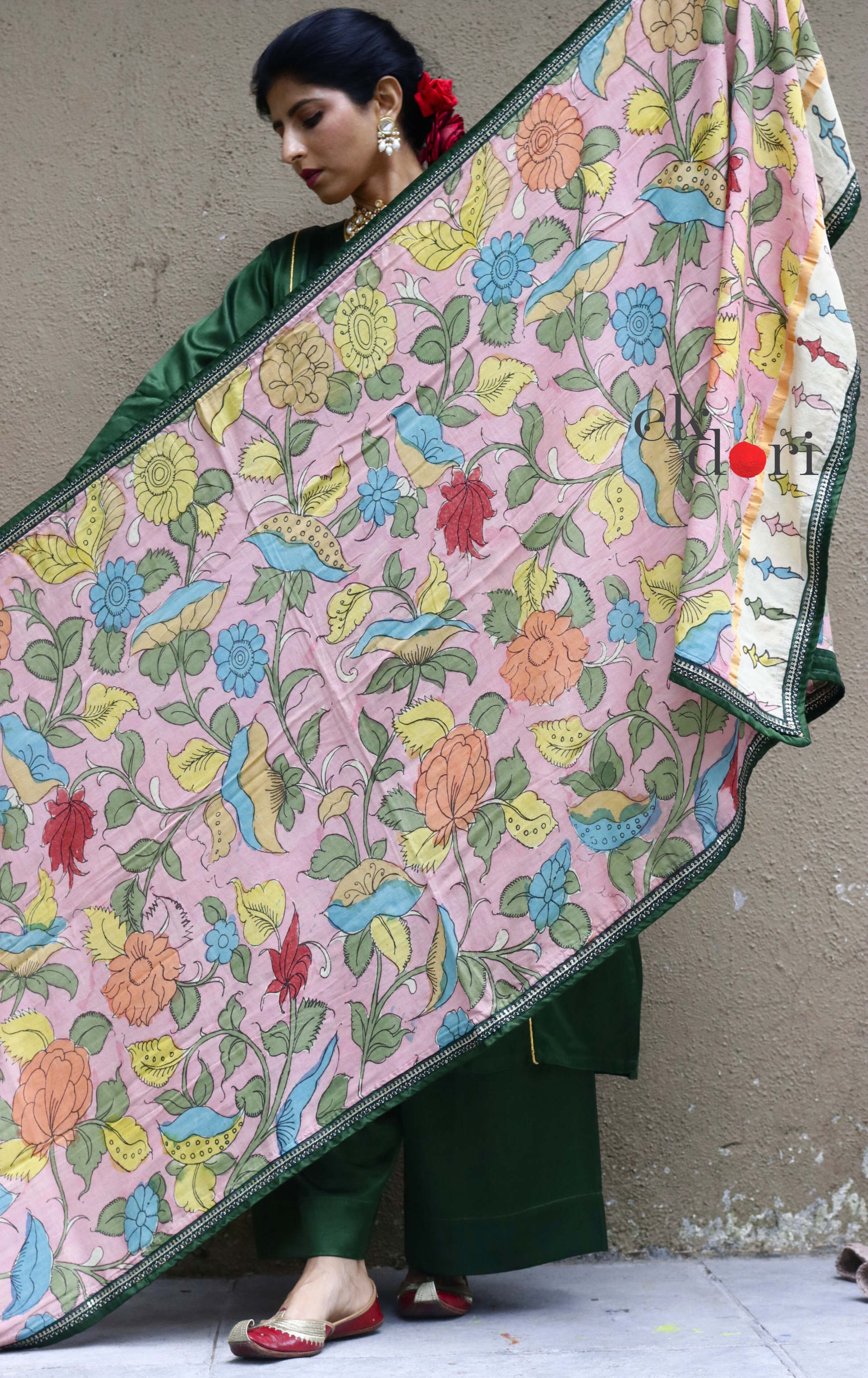 - Handpainted Kalamkari Dupatta With Lace & Finishing