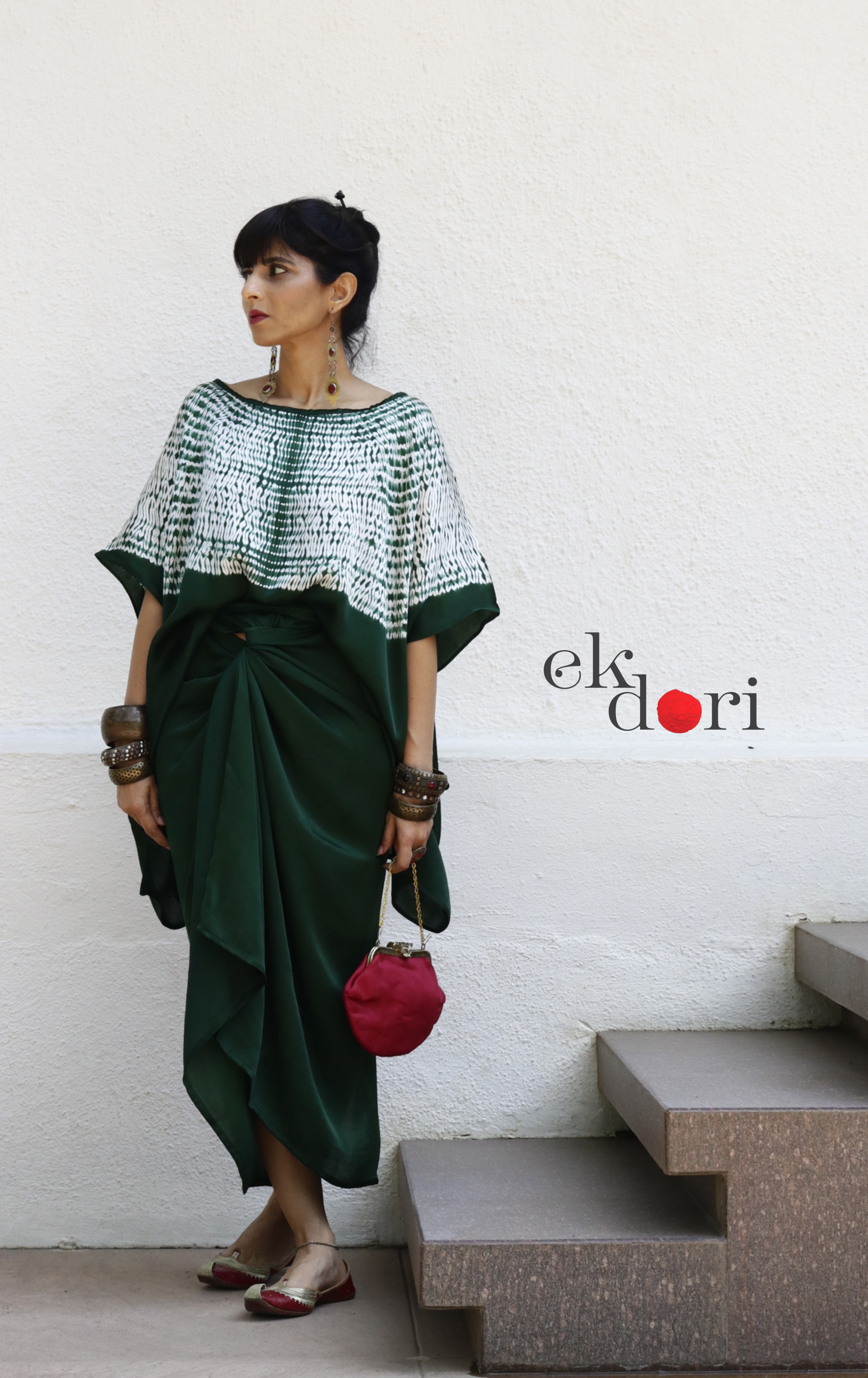 Shibori modal co-ord skirt set 'Forest Fairy' is a celebration of heritage and modern design, featuring a fluid wrap skirt paired with a relaxed, oversized top. Crafted from luxuriously soft modal, this ensemble reimagines the craft of Shibori through a contemporary, fashion-forward lens.